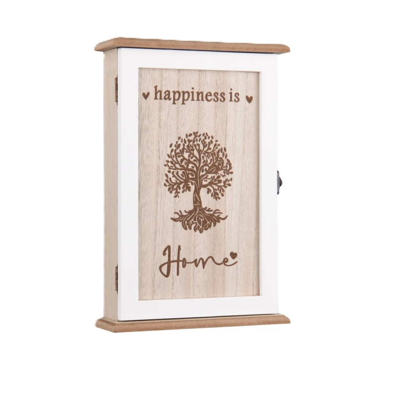 Ajoutez une touche d’élégance à votre intérieur avec cette magnifique boîte à clés en MDF (panneau de fibre de densité moyenne). Avec son design naturel, associant des tons boisés et blancs, et son inscription « Happiness is Home » gravée délicatement sur la porte, cette boîte est bien plus qu’un simple rangement : c’est un élément déco à part entière.