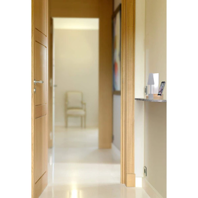 Lampe à poser à éclairage indirect. Interrupteur tactile sur le socle en bois permettant de choisir entre 3 niveaux d’intensité lumineuse.