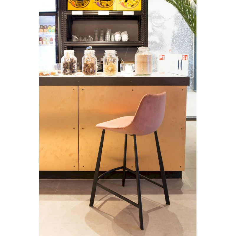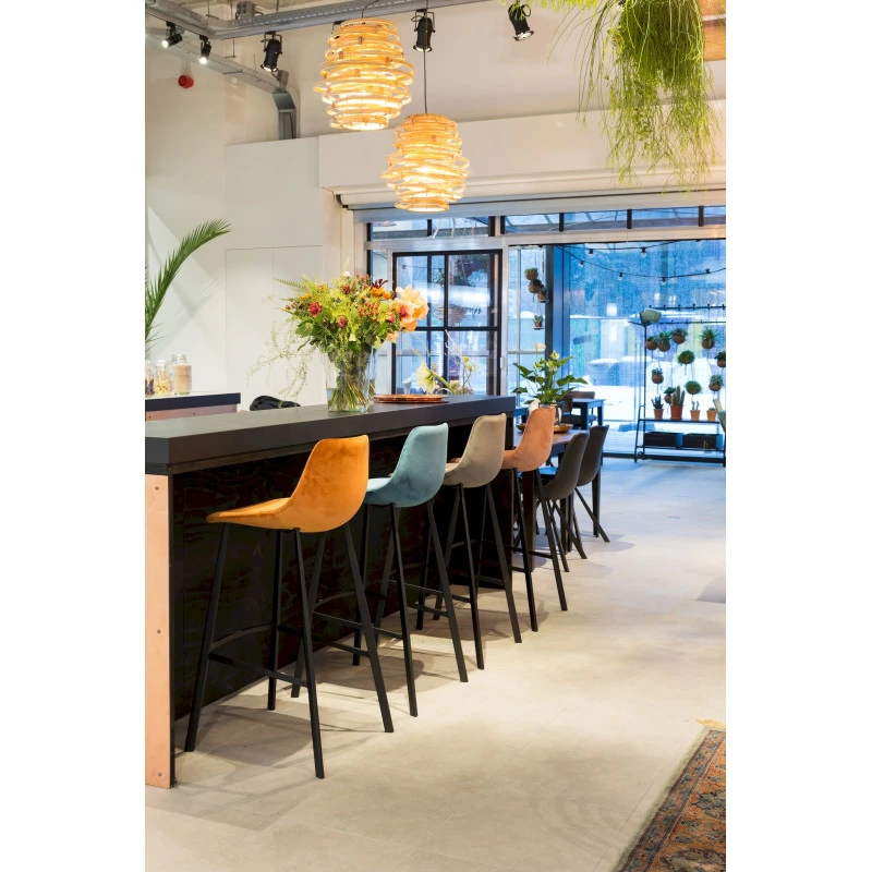 Le tabouret velours Franky est ici vendu en lot de 2 uni. Celui ci est constitué d’un piètement en métal de couleur noir avec une élégante et confortable assise coque rembourrée d’une mousse polyuréthane d’une densité 35 kg par M3. Le revêtement est en velours 100% polyester pour une meilleure solidité dans un usage qui peut être intensif.