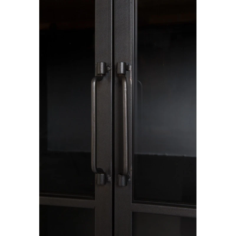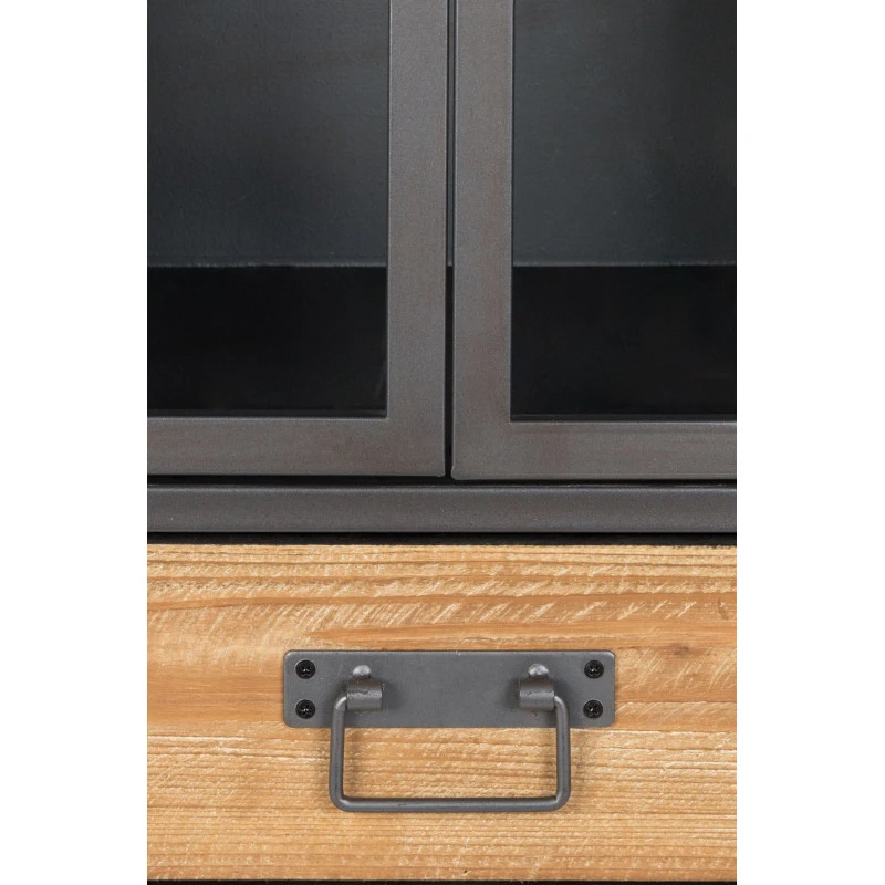 Les matériaux utilisés pour sa fabrication sont très à la mode et lui donne cet aspect scandinave. Son cadre est en métal gris et ses rangements sont en bois naturel de sapin. Enfin les portes sont en verre trempé.