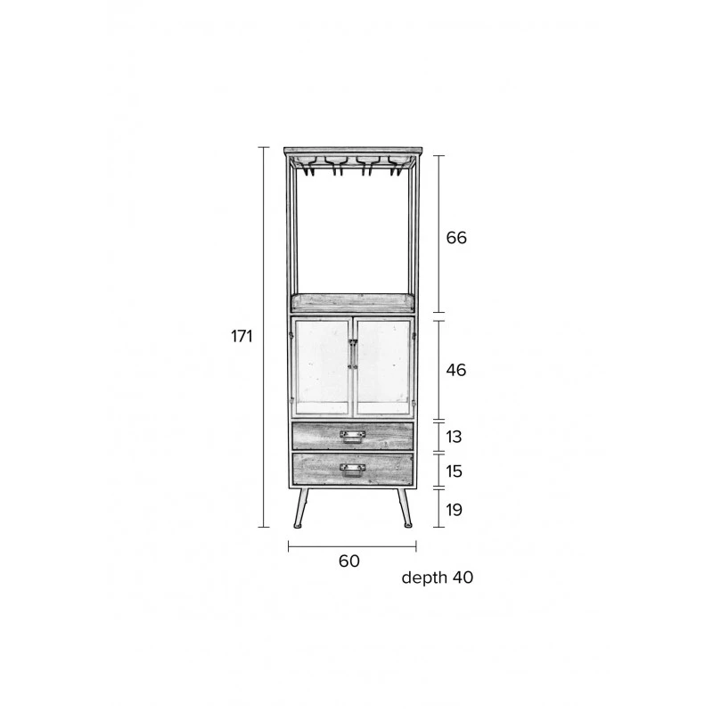 Ce meuble en bois et métal Damian est destiné à un rangement de la vaisselle et autres bouteilles. Il s’agit d’une grande armoire de 170 cm de haut vous permettant de ranger les verres à l’aide des rangements en rangées.