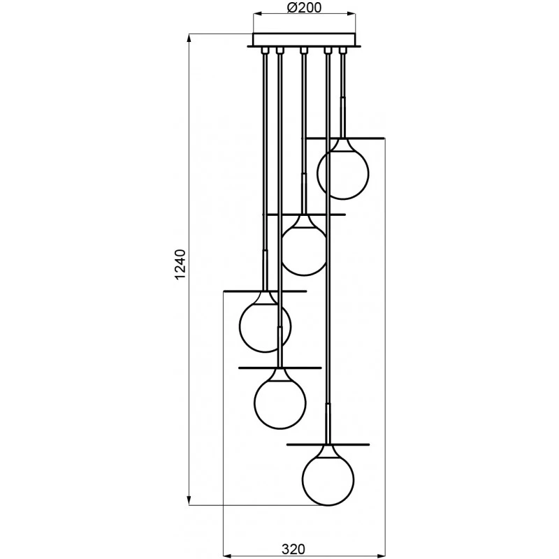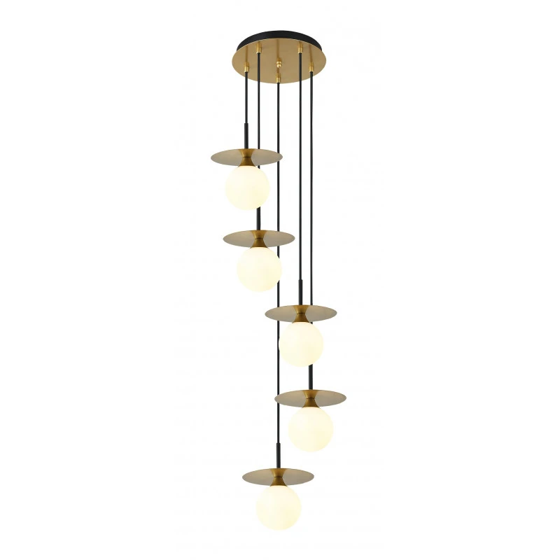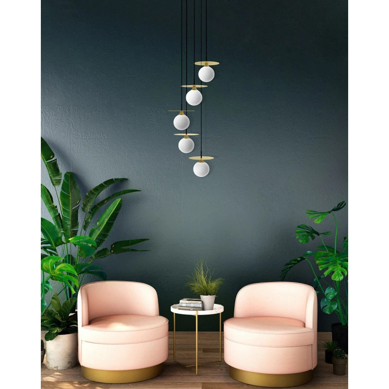 La suspension Cascade est un luminaire de plafond vintage composé de 5 fils pendants avec diffuseur en verre opalin placés en spirale grâce à leurs hauteurs différentes. Sa hauteur de 124 cm permettra à ce luminaire d’offrir un style élégant et haut de gamme à une descente d’escalier, ou au dessus d’une mezzanine.