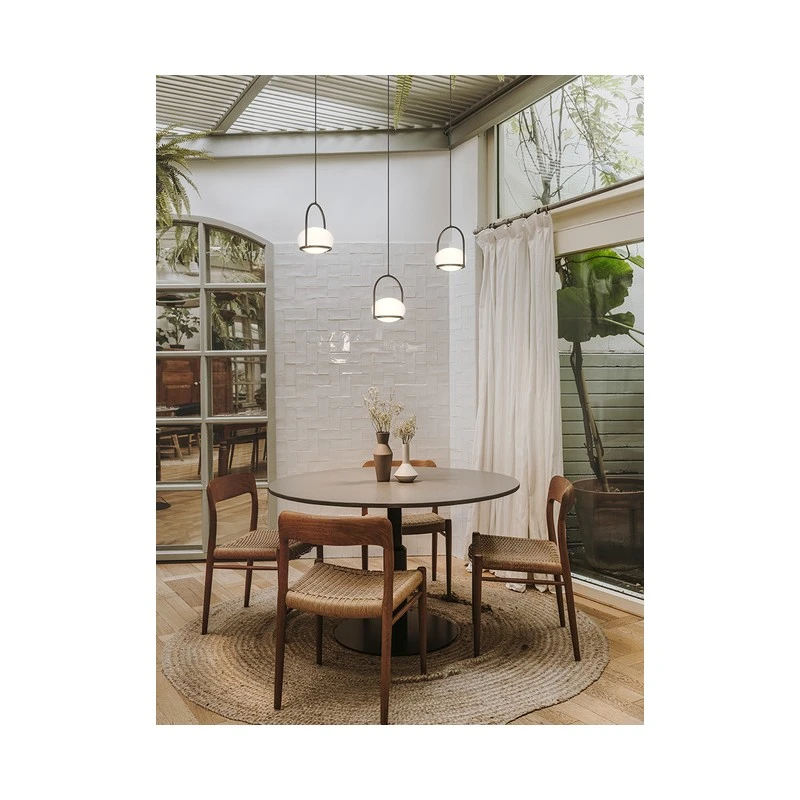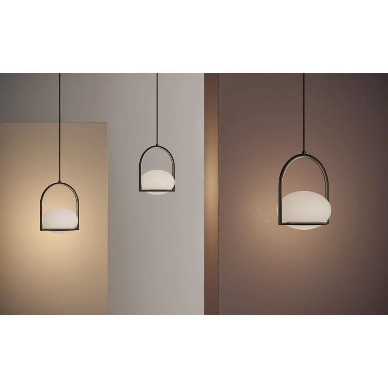 La suspension Coco se décline un plusieurs tailles, nous vous présentons ici la lampe suspendue une lampe. Elle est disponible en couleur noir ou or. Nous apprécions particulièrement son diffuseur opaque blanc.