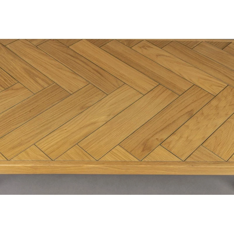 Fabriquée en bois pour le plateau avec un placage en acacia (naturel ou noir) en forme de chevron du plus bel effet ou bien un bois en MDF plaqué chêne.