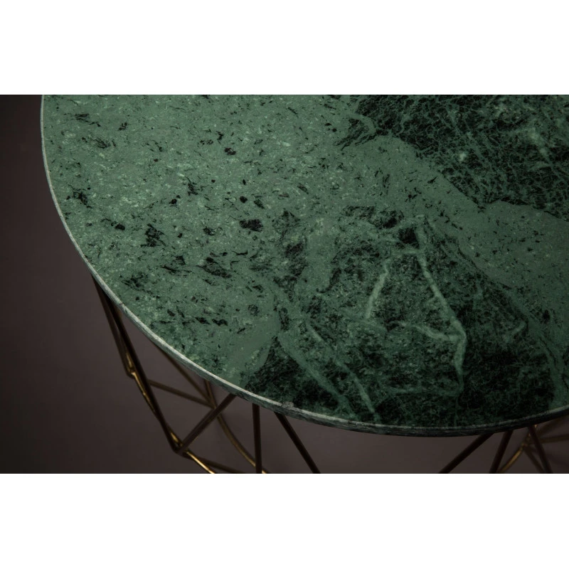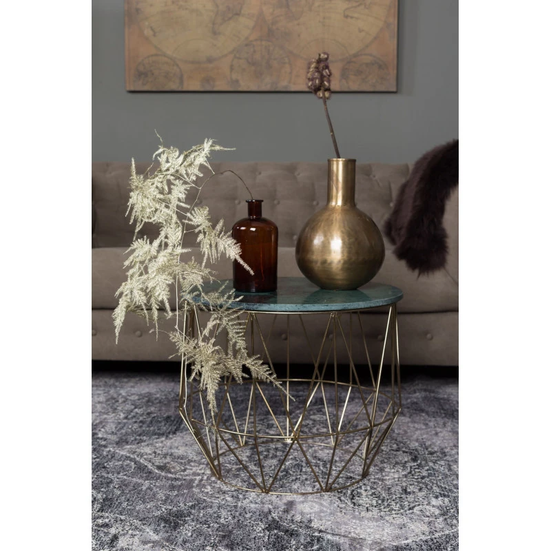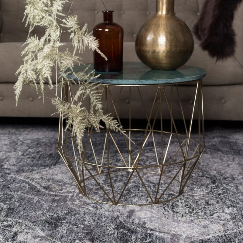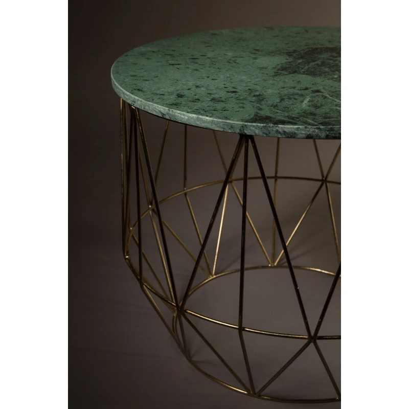 Son cadre, quant à lui est en métal enduit de laiton, de forme arrondie. La base a un diamètre réduit par rapport au plateau, ce qui lui donne cet aspect design. Les tiges du cadre sont placées de manière à créer des formes géométriques, rectangulaire, et triangulaire.