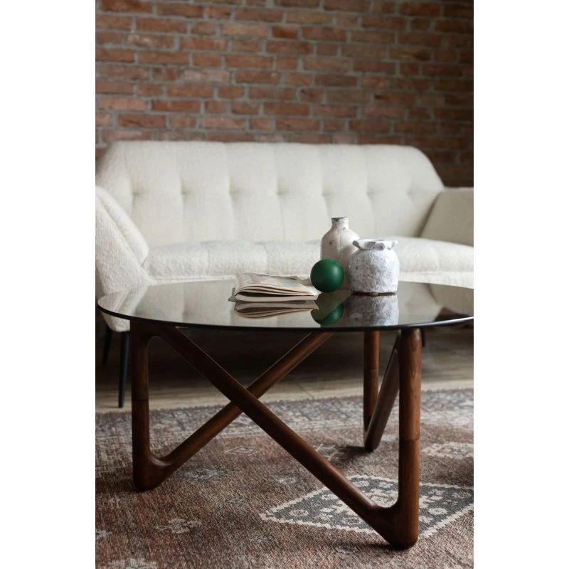 Cette table basse en bois ronde séduit par son design épuré et sa finition impeccable. Son pied en bois de chêne massif et son plateau en verre fumé transparent confèrent une note chaleureuse et naturelle à votre espace de vie.