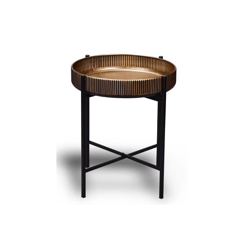Élégante table d’appoint au style vintage en métal de couleur noir et or. Disponible ici en version 42 cm de diamètre.