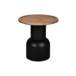 La table d’appoint Ronja est ici proposée en version 50 cm de diamètre avec pied en métal et plateau texturé bois.