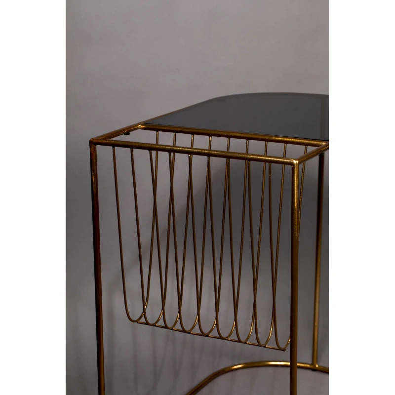 Vous trouverez un plateau en verre trempé de couleur noir et d’une épaisseur de 5 mm, quant à la partie porte journaux, elle est faite en métal avec une profondeur de 29 cm.