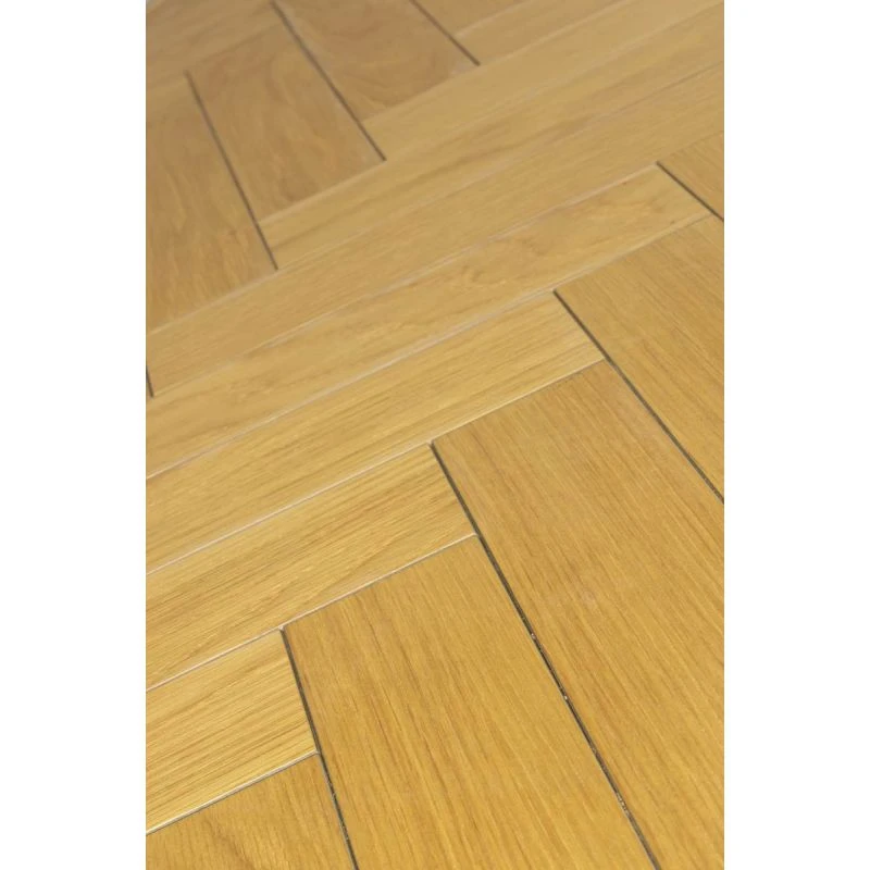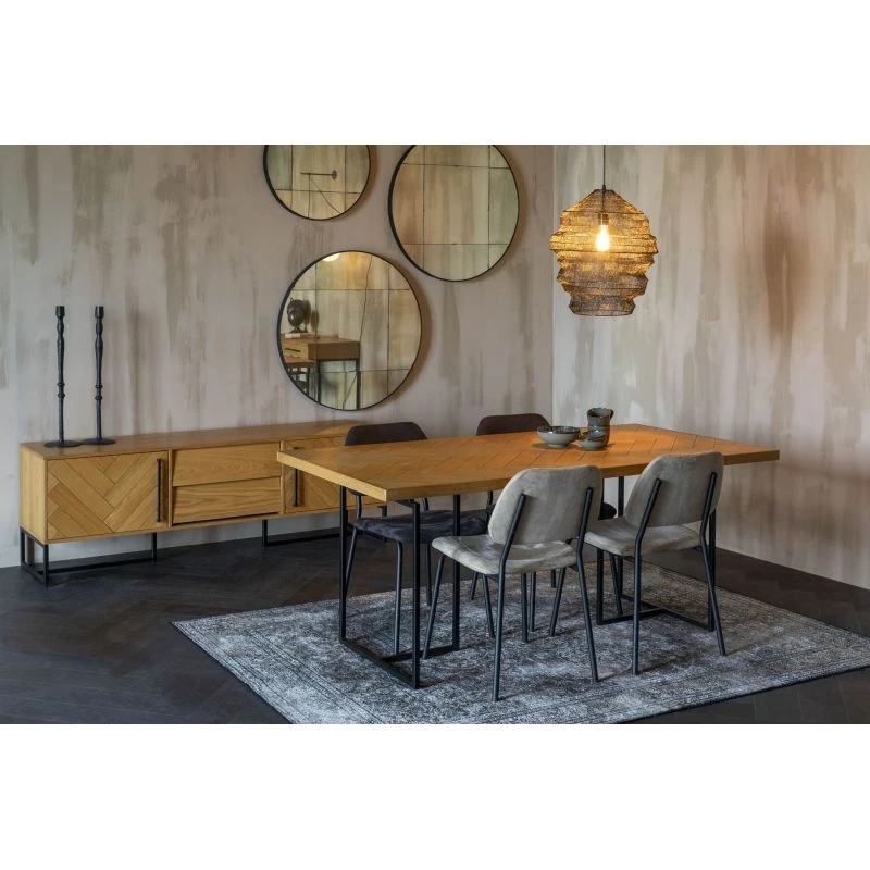 Cette superbe et très chic table de repas moderne propose sur tout son plateau en en MDF plaqué chêne avec finition en PU chêne et aux motifs arrêtes de chevron.