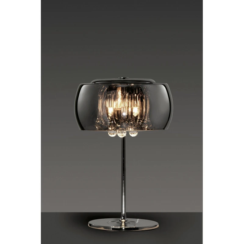 Vapore est le nom de ce luminaire à poser. De couleur gris chromé éteint, il rendra un bel effet lorsqu’il sera allumé, faisant apparaître 12 pampilles en verre. Les pampilles sont de deux tailles différentes et les grandes se laissent apparaître discrètement en bas de l’abat-jour.