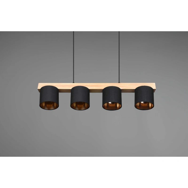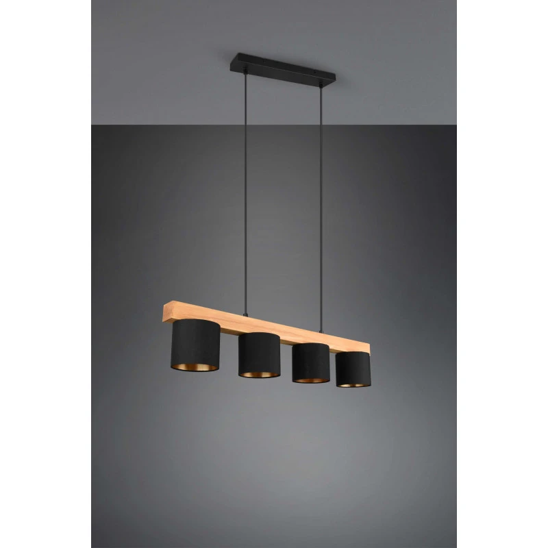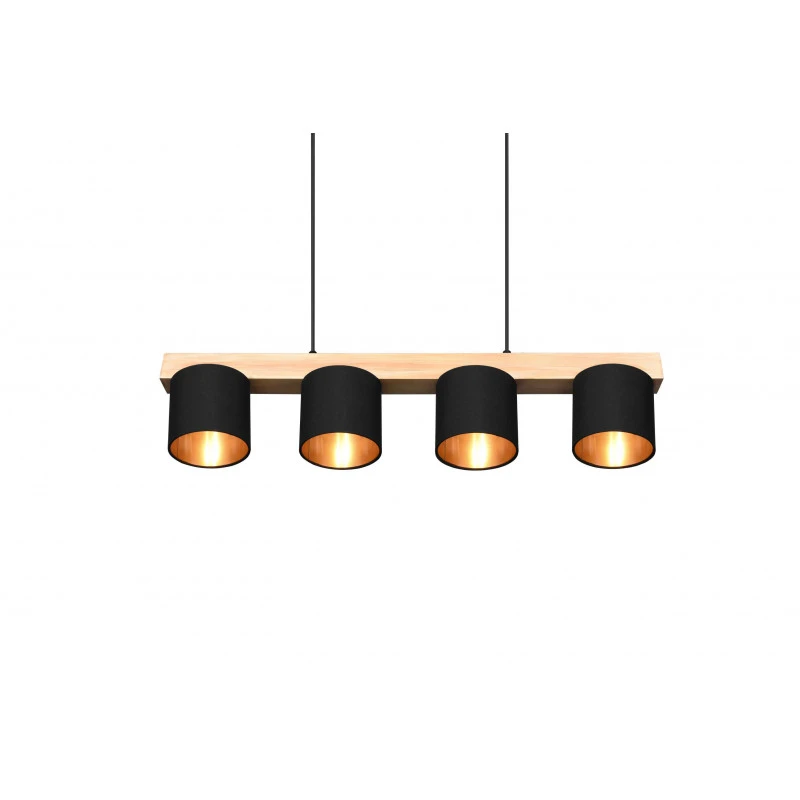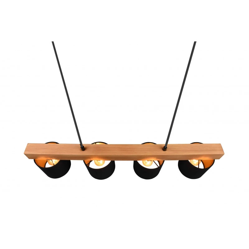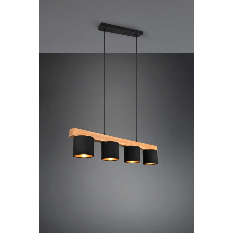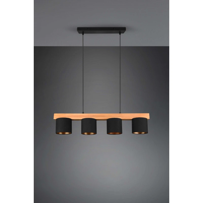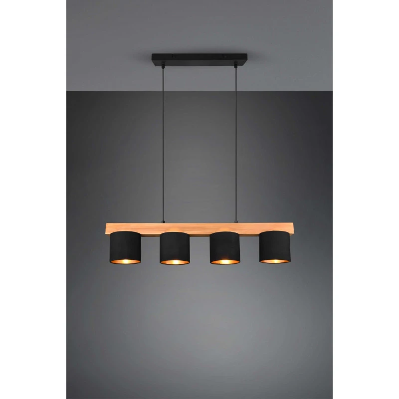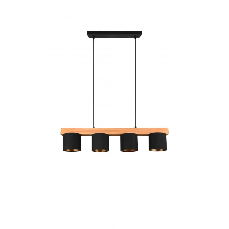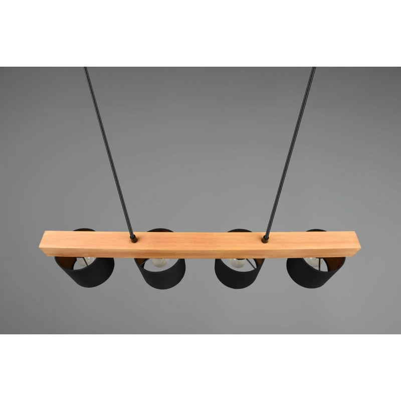 La suspension Cameron est un luminaire Trio au design simple mais très élégant. Ce luminaire se fixe au plafond et s’ajuste en hauteur. Deux fils viennent maintenir une tige horizontale en bois naturel sur laquelle nous trouvons quatre abats-jours.