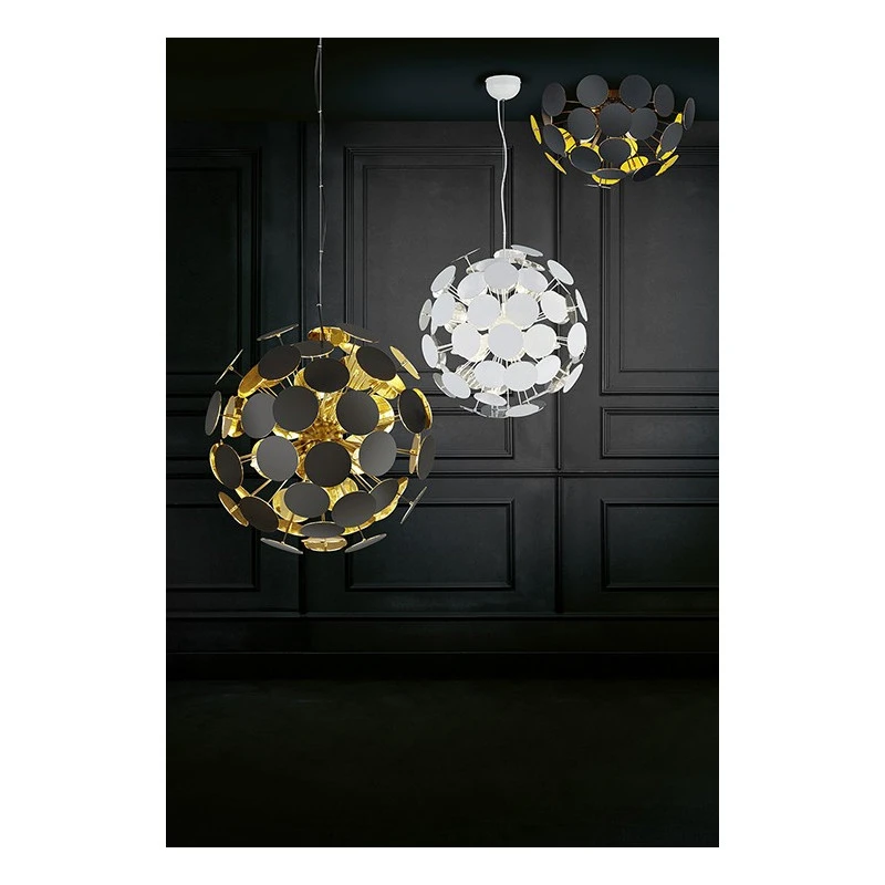 La suspension design en métal blanc ou noir de la collection Discalgo pourra être complétée par d’autres luminaires de la même collection afin d’ajouter une touche absolument 70’s tout en étant très actuelle et moderne.