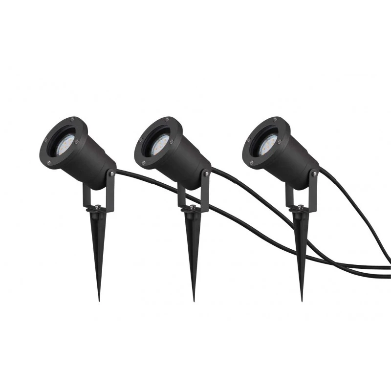 Les trois spots Ubangi sont reliés au même fil d’alimentation. A l’aide de leur piquet ils trouveront tout naturellement leur place dans une pelouse en éclairant une façade ou bien un bel arbre comme un olivier par exemple.